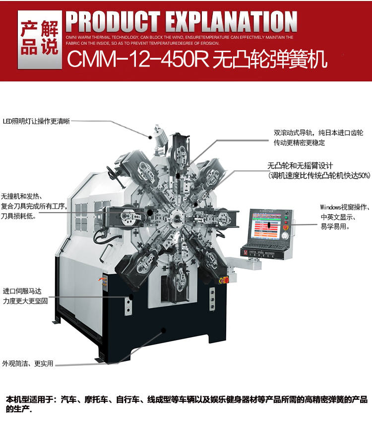 其次,永騰無凸輪彈簧機上無滾動式導軌,可長久保持精度。無撞機和發(fā)熱,復合刀具完成所有工序,工具損耗低。適用于汽車、摩托車、自行車、線成型等車輛以及娛樂健身器材等產(chǎn)品所需的高精密彈簧的產(chǎn)品的生產(chǎn).