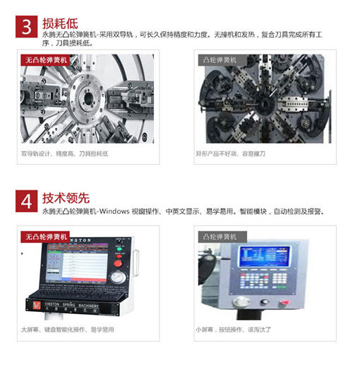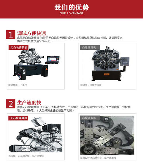 在近幾年無凸輪彈簧機逐漸得到彈簧生產廠家的認可。與傳統(tǒng)帶凸輪彈簧機相比,永騰無凸輪彈簧機在設計上采用獨特的無凸輪和無搖臂設計(調機速度比傳統(tǒng)凸輪機快達50%以上),其中無撞機和發(fā)熱、復合刀具完成所有工序,刀具損