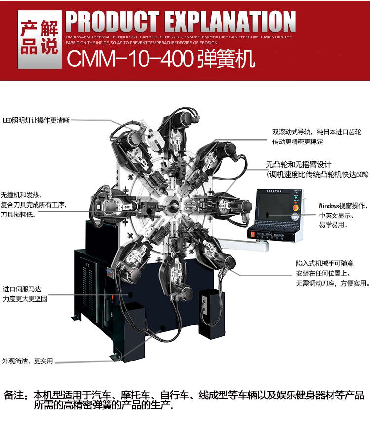 獨特的無凸輪和無搖臂設(shè)計,由多組伺服馬達獨立控制,可以生產(chǎn)各種各樣異型彈簧、壓簧、雙扭簧、電池簧、扁簧(發(fā)條簧)及各種線成型等。精密準確、調(diào)機快速、穩(wěn)定可靠。